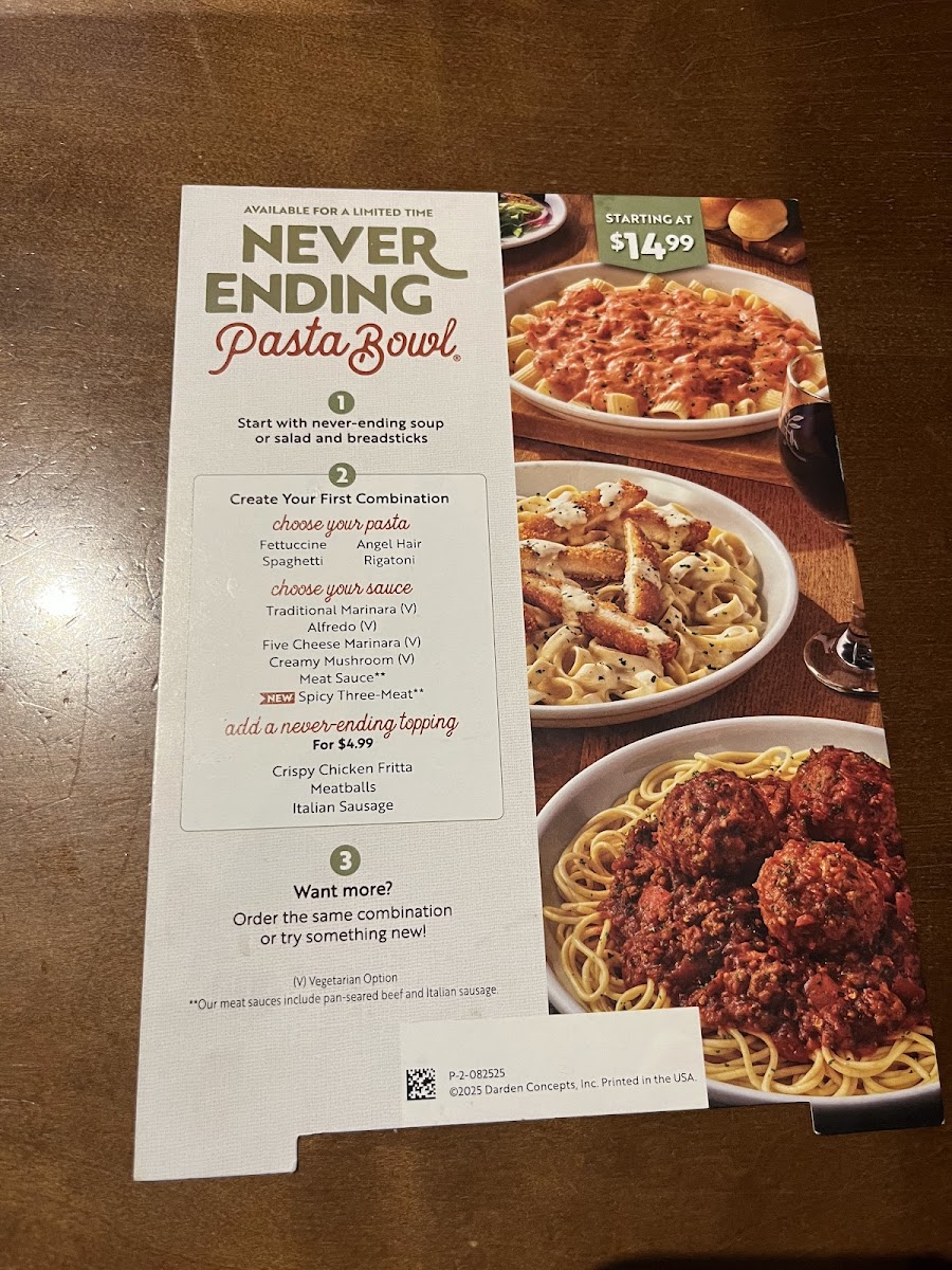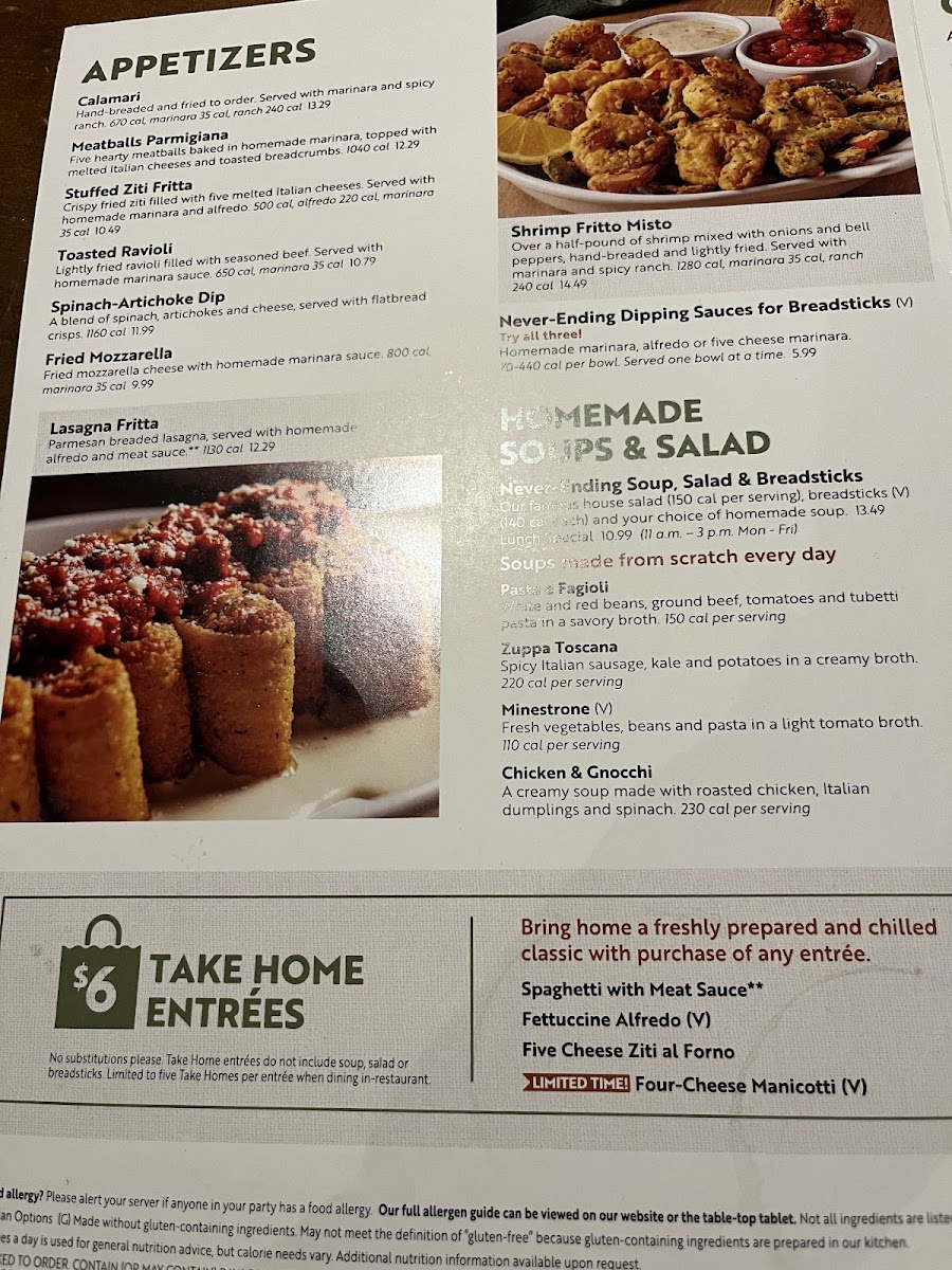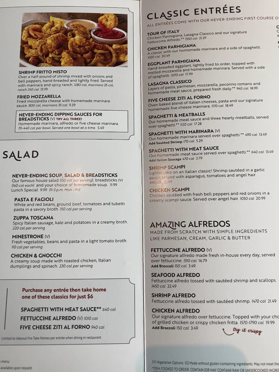 Olive Garden Italian Restaurant offers a rich menu that captures the essence of classic Italian cuisine with a modern, family-friendly twist. Located in Baltimore, this Mediterranean-inspired eatery is known for its warm ambiance and a variety of dishes that cater to diverse tastes, including gluten-free and seafood options. The appetizers set the tone—calamari, hand-breaded and fried to order, arrives crisp with zesty marinara and spicy ranch, while the Meatballs Parmigiana delivers hearty flavors with melted Italian cheeses and toasted breadcrumbs. The Lasagna Fritta is a standout, combining parmesan-breaded layers with both rich Alfredo and robust meat sauce made from pan-seared beef and sausage.